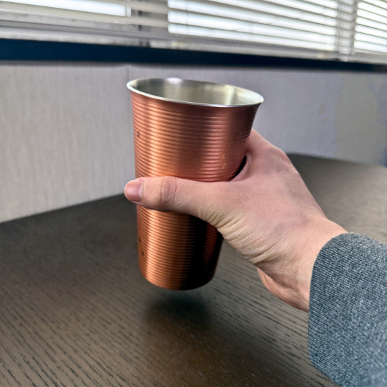 高い熱伝導率の純銅 錫被き仕上げ 浅型鍋。鎚目入りデザインが洗練された一品。手に馴染む重さと安定感でハイレベルな調理を。容量3200ml、製品寸法240Φ×80H(mm)。