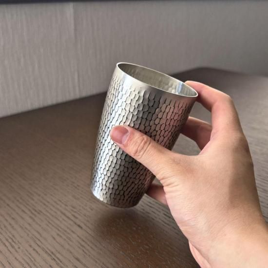 伝統的な鎚目模様が施されたこのタンブラーは、見た目の美しさだけでなく、熱伝導にも優れています。